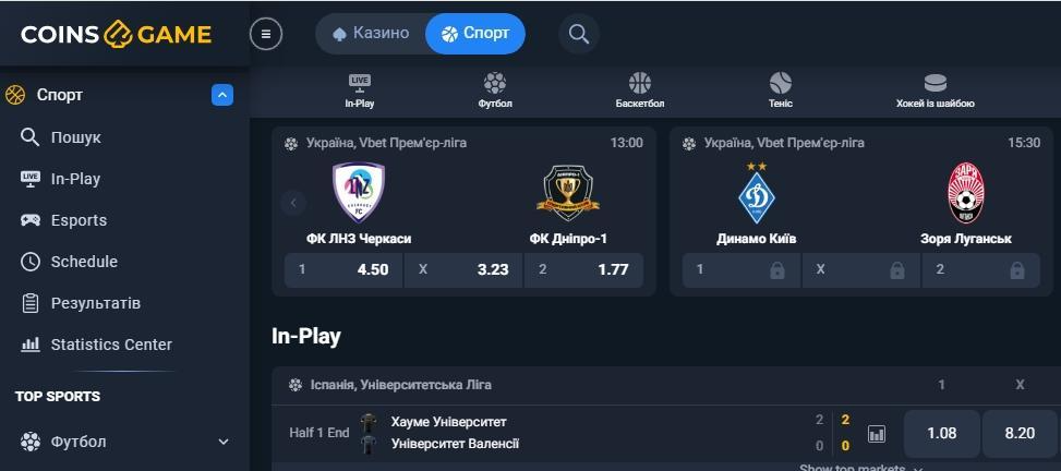 На даний момент клієнтам Сoins game доступні ставки на спортивні події, а також кіберспорт. Дізнаємося докладніше про можливості онлайн майданчика для ставок, які події та коефіцієнти пропонує букмекер.