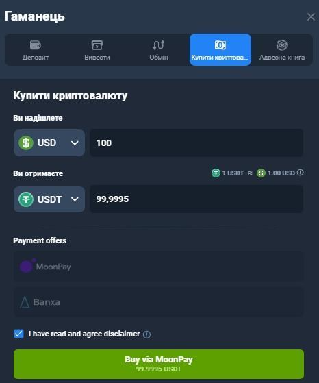 Купити криптовалюту. На сайті є можливість купівлі та обміну криптовалют. Потрібно натиснути на посилання «Купити криптовалюту» і з'явиться спеціальна форма: