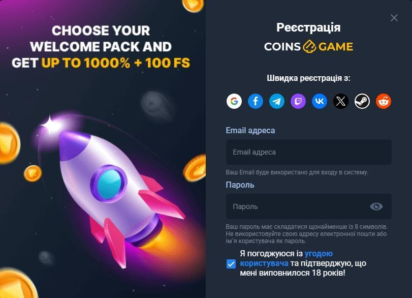 Увійти обліковий запис Сoins game дуже просто, це можна зробити в один клік – через аккаунт Google, Фейсбук або іншим способом. Є й стандартна форма, коли гравець вказує номер телефону або електронну пошту та пароль.