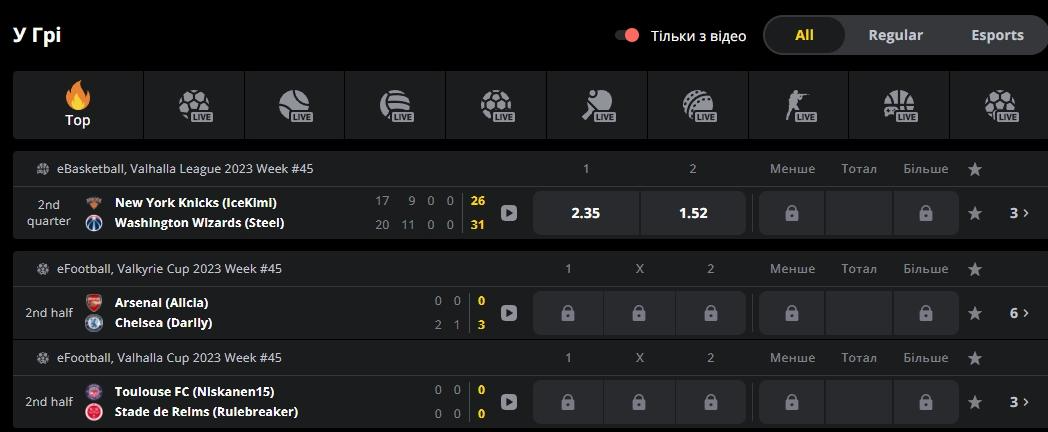- Онлайн-стеження. Користувачі можуть легко відстежувати поточні події та результати в режимі реального часу, а також робити ставки по ходу матчів, стежачи за зміною коефіцієнтів.