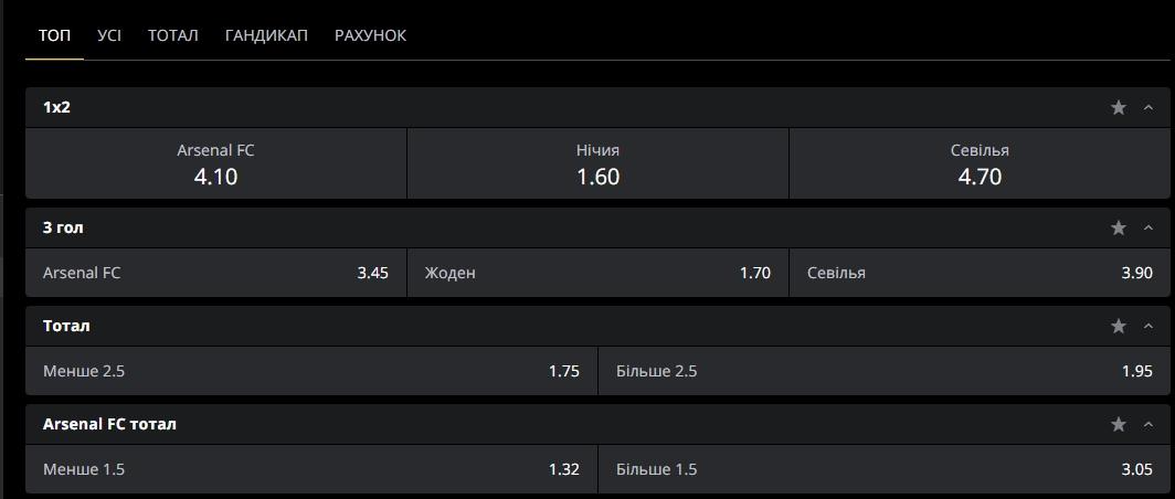 Є ставки на комбіновані події – перемога+тотал, фора+тотал, тайм+фора тощо. Всі маркети можна додати до «Вибраного», клацнувши по зірочці, розташованій навпроти. У графічному поданні до розписів додаються турнірна таблиця, результати особистих зустрічей, тактична схема команд.