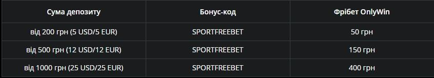 Вітальний бонус. Новачки отримують доступ до Welcome-бонусів двох типів – фрібетів на 50,150,400 гривень або грошовому – 100% на перший депозит, до 5000 гривень. Отримати фрібет зможуть клієнти, які поповнили рахунок від 200 гривень з бонусним кодом SPORTFREEBET. Далі потрібно вибрати один із бонусів та активувати його в особистому кабінеті.