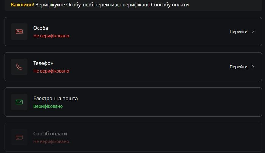 В особистому кабінеті клієнт Pokerbet підтверджує платіжний метод (карту), особисті дані та номер телефону. У розділі «Верифікація» доступні всі пункти з інструкціями, які потрібно виконати.