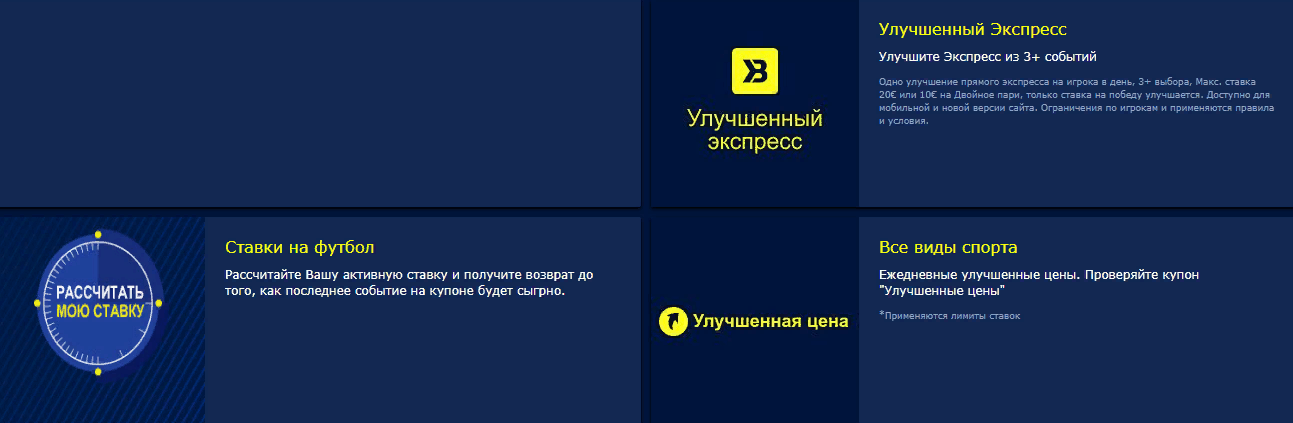 Друга акція для клієнтів – «покращені коефіцієнти». Щодня компанія пропонує події, зробивши ставки на які, ви зможете отримати збільшення коефіцієнта. Необхідно зробити ставку типу експрес, що включає не менше трьох подій зі списку, наданого William Hill, і ставки будуть прийняті і розраховані за збільшеним коефіцієнтом, а не за стандартним, який був встановлений конторою в лінії.