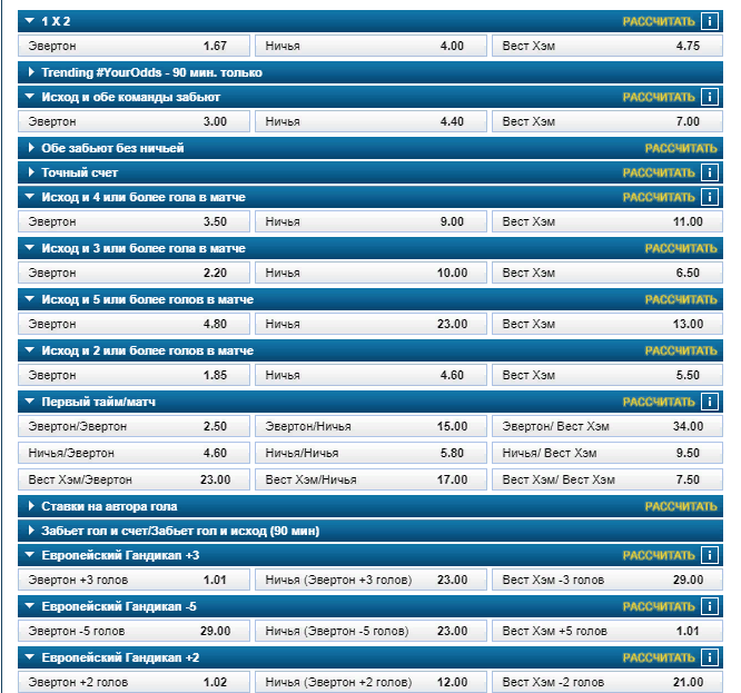 Перший приклад, який ми розглянемо – це матч англійської Прем'єр-ліги з футболу між командами «Евертон» і «Вест Гем Юнайтед». Фаворитом зустрічі букмекерська контора називає господарів зустрічі – коефіцієнт на «Евертон» встановлений на рівні 1.67. На їхніх суперників - «Вест Гем» цей показник встановлено на рівні 4.75. Базова фора поєдинку – 1 гол. Фора -1 на «Евертон» оцінюється в 2.60, а фора +1 на «Вест Гем» – в 2.10. Базовий тотал встановлений на рівні 2.5 гола. Ставка на тотал більше 2.5 оцінена в 1.61, тотал менше 2.5 – в 2.20.