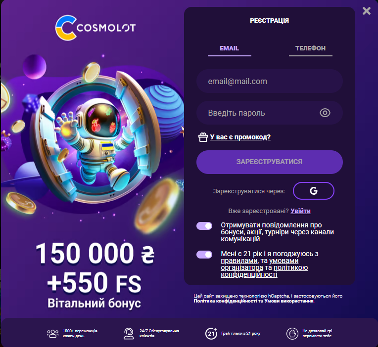 Однак Казино Космолот тимчасово призупинили реєстрацію нових гравців. Попередньо створені акаунти ще мають можливість для авторизації, проте нові кабінети створити наразі неможливо.