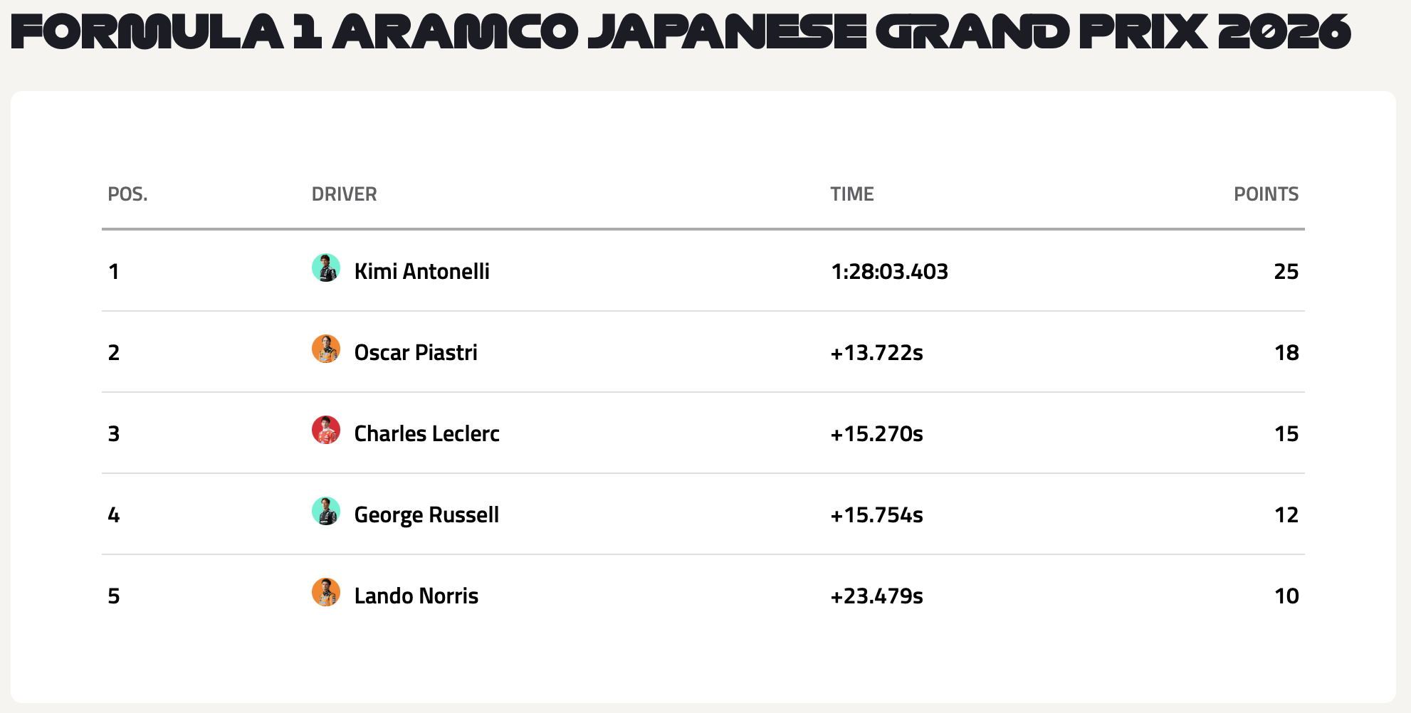 У Формулі-1 Гран-прі Японії завершився перемогою Андреа Кімі Антонеллі, який став наймолодшим лідером чемпіонату в історії після другого поспіль успіху.