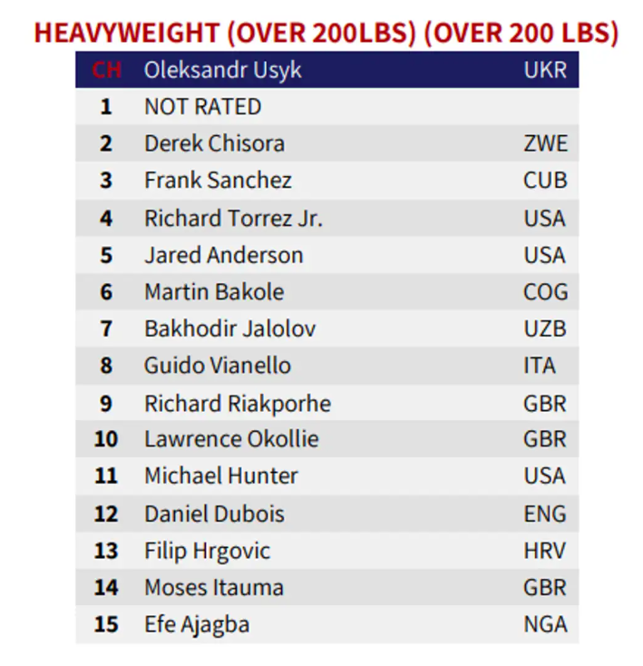 Чемпіонський статус у рейтингу окремо займає Олександр Усик (24–0, 15 КО), який володіє поясом IBF, а також титулами WBA, WBC і WBO. Українець нещодавно відібрав титул у британця Даніеля Дюбуа, що призвело до різкого падіння останнього — з п’ятого місця одразу на 12-те.