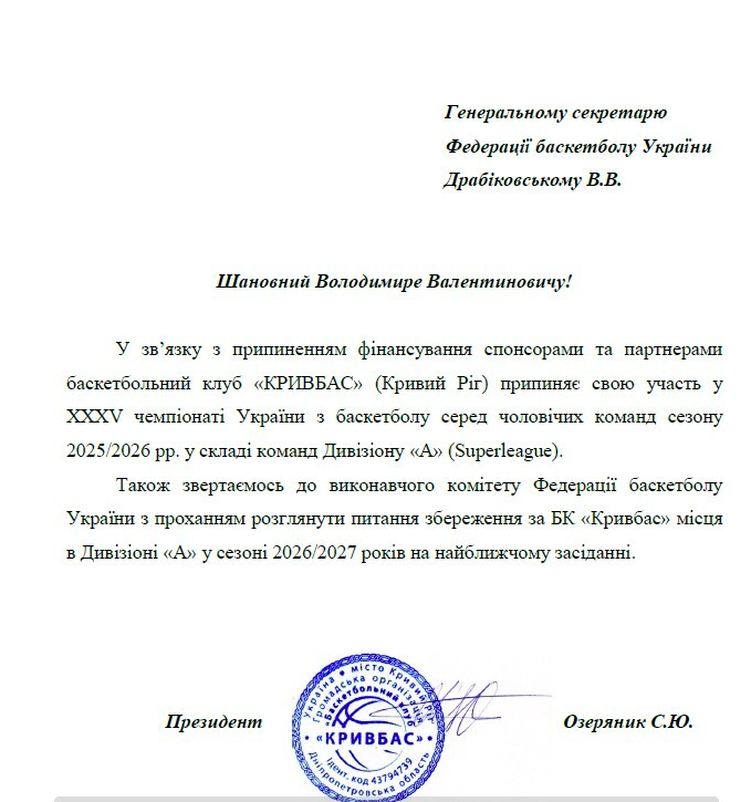 Баскетбольний клуб Кривбас з Кривого Рогу офіційно поінформував Федерацію баскетболу України про рішення тимчасово припинити участь у XXXV чемпіонаті України серед чоловічих команд сезону 2025/2026 у Дивізіоні «А» (Суперліга).