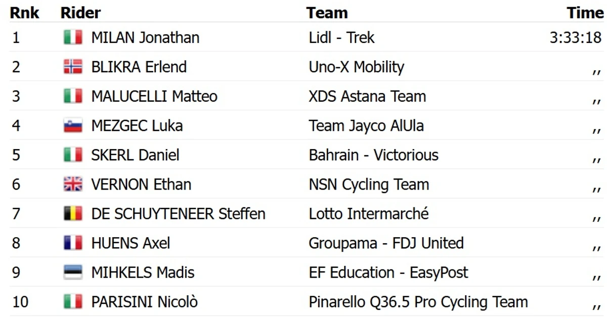 Долю етапу вирішив масовий спринт, у якому Мілан випередив норвежця Ерленд Блікру з команди Uno-X Mobility та італійця Маттео Малучеллі, який представляє XDS Astana. Для Мілана це вже друга поспіль перемога на етапах цієї гонки, що підтверджує його відмінну форму.
