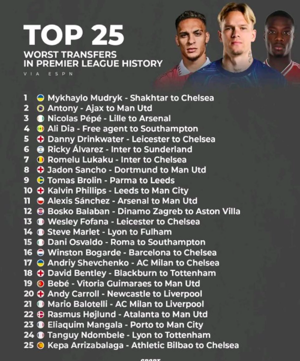 Авторитетне американське видання ESPN склало список із 25 найневдаліших трансферів в історії англійської Прем’єр-ліги. Перше місце в антирейтингу посів перехід українського вінгера Михайла Мудрика з Шахтаря до Челсі.