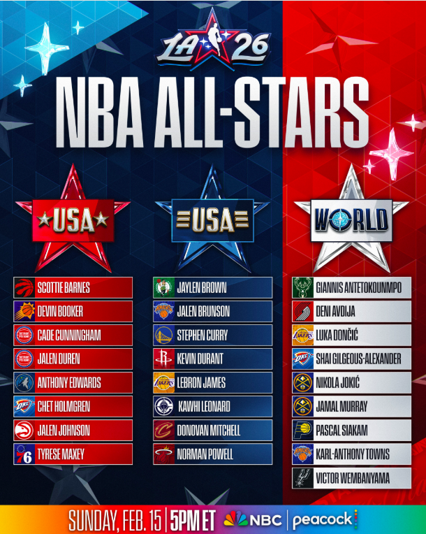 Національна баскетбольна асоціація (НБА) представила повні склади учасників Матчу всіх зірок-2026, який пройде під назвою «США проти світу».