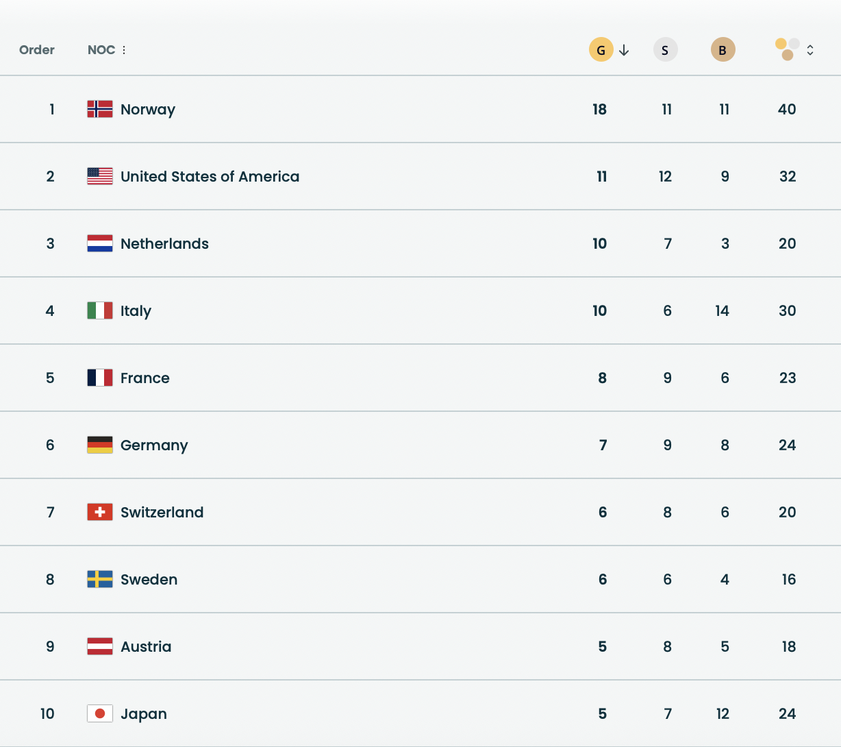Це вже четверта поспіль перемога Норвегії у медальному заліку зимових Олімпійських ігор. Востаннє норвежці не ставали першими у 2010 році, коли посіли четверту позицію.
