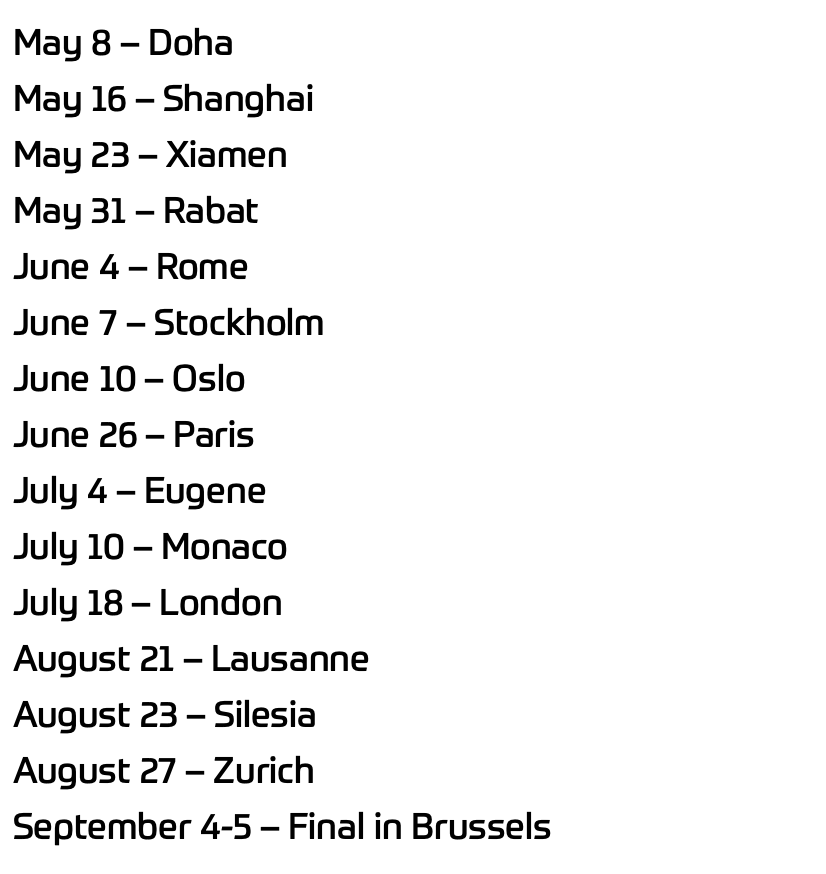 Сезон стартує 8 травня в Досі, після чого еліта світової легкої атлетики змагатиметься у Шанхаї, Сямені, Рабаті, Римі, Стокгольмі, Осло, Парижі, Юджині, Монако, Лондоні, Лозанні, Сілезії та Цюриху.