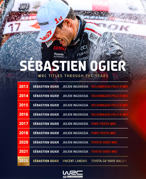 Французький гонщик Себастьєн Ож'є став переможцем чемпіонату світу з класичного ралі (WRC) у сезоні-2025. Він разом зі штурманом Вінсент Ланда випередили британців Елфіна Еванса та Скотта Мартіна лише на 4 очки.