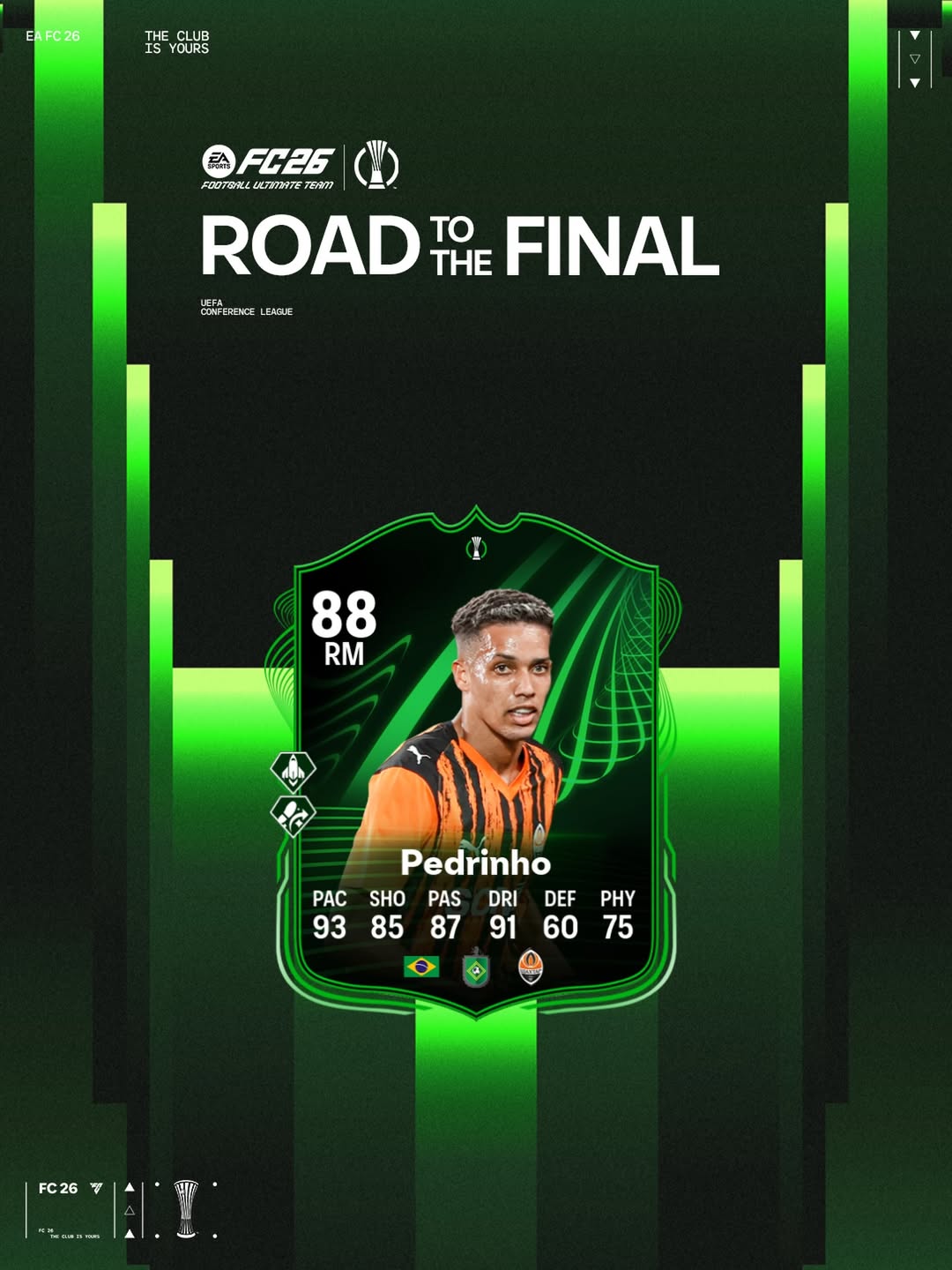 Бразильський півзахисник Педрінью з Шахтаря (Донецьк) отримав спеціальну картку у футбольному симуляторі EA Sports FC 26 в режимі Ultimate Team. Вона з’явилася в межах кампанії UEFA Road to the Final.