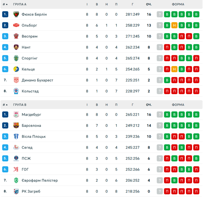 У Лізі чемпіонів з гандболу відбулися протистояння 8-го туру. Як і раніше, лідерами своїх груп лишаються Фюхсе Берлін та Магдебург.