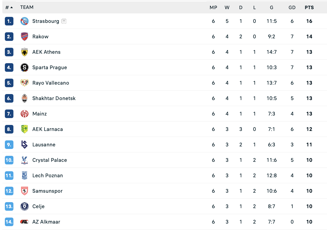 Набравши 13 очок, Шахтар фінішував шостим у загальному етапі та напряму вийшов до 1/8 фіналу Ліги конференцій, відставши від першого місця на три бали.