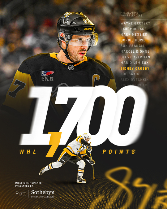 Кросбі став єдиним чинним хокеїстом НХЛ, який подолав позначку у 1700 очок, та лише дев’ятим гравцем в історії, що зумів досягти такого показника.