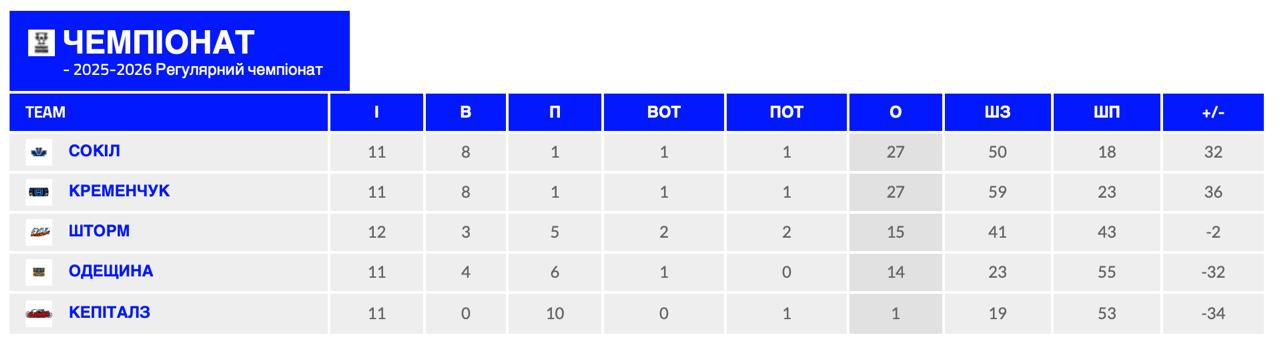 У чемпіонаті України з хокею відбувся поєдинок між Штормом та Соколом, у якому київська команда здобула перемогу з рахунком 6:3 та піднялася на першу сходинку турнірної таблиці. Сокіл тепер випереджає Кременчук на один бал за рівної кількості зіграних матчів, тоді як Шторм наразі утримує четверте місце.
