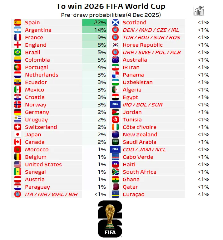 Згідно з прогнозом, найбільш реальні шанси на тріумф має збірна Іспанії, чинний чемпіон Європи. Її потенціал перемоги на прийдешньому Мундіалі оцінюють у 22%. На другому місці — Аргентина, яка захищатиме титул чемпіона світу. Підопічним чинного володаря Кубка світу відводять 14% на успіх у США, Мексиці та Канаді.