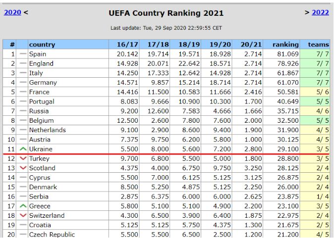 Україна піднялася на дві позиції в таблиці коефіцієнтів УЄФА