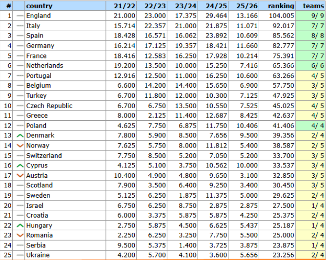Так, за підсумками єврокубкового тижня, Україна зберегла свою, 25-у позицію в рейтингу УЄФА.