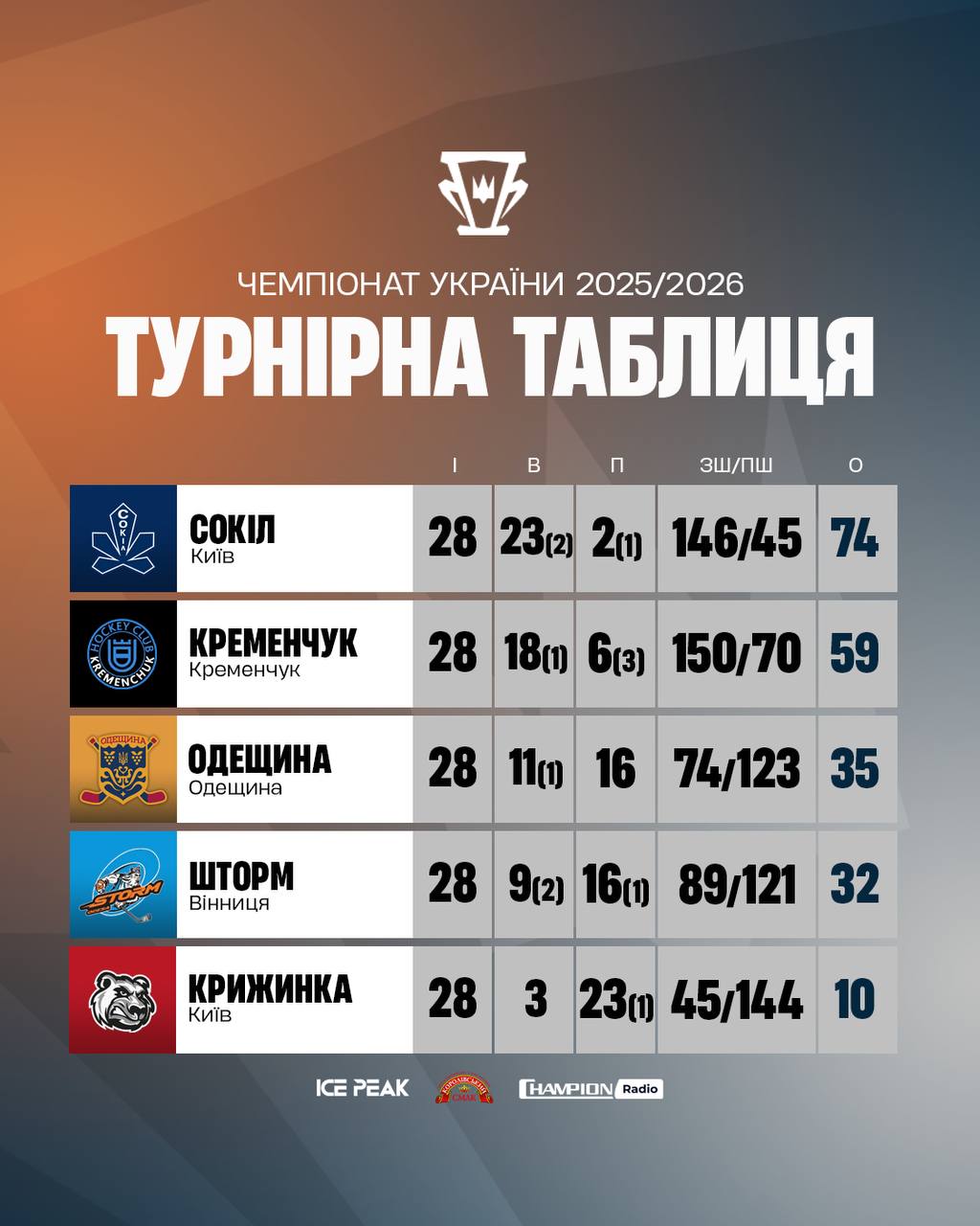 У чемпіонаті України з хокею завершився регулярний сезон, за підсумками якого визначилися учасники та пари півфіналу плей-оф.