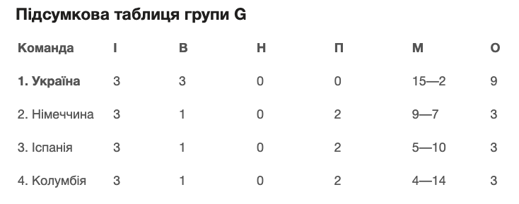 У квартеті G «синьо-жовті» зустрічалися з командою Іспанією і тріумфували з рахунком 6:1. Українці виграли всі три поєдинки в групі й вийшли до плей-оф із першого місця.