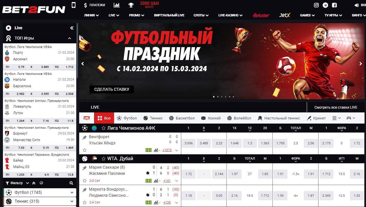 В букмекерской контора BET2FUN ставки онлайн доступны игрокам из Украины. Среди основных плюсов отметим большой выбор событий, выгодные коэффициенты и привлекательные бонусы. Пока игрокам доступно лишь одно приложение Андроид и функциональная мобильная версия. Из недостатков отметим отсутствие украинской лицензии и нет приложения IOS.