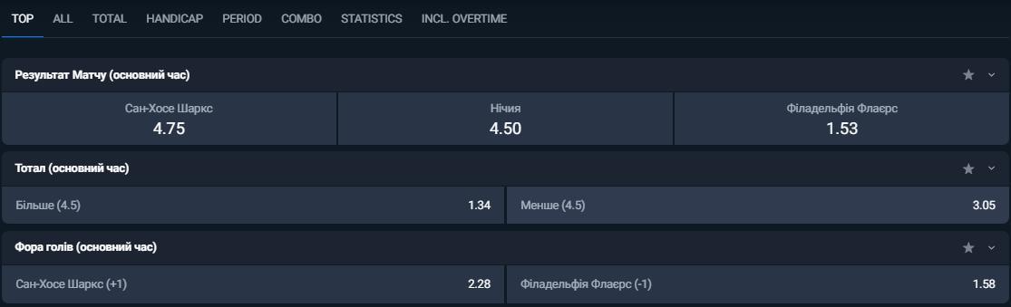 Игроки могут поставить на события в периодах, на основное и дополнительное время, удаления и личные показатели игроков. До 5 типов общих и 3 индивидуальных тоталов доступно в росписи.