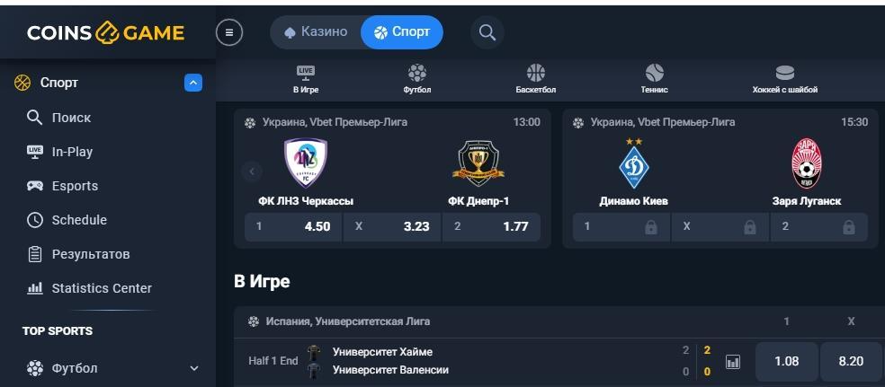 Пользователям из Украины официальный сайт БК Сoins game доступен всегда. Разделы быстро загружаются, нет задержек при работе с линией и статистикой. Чтобы переключиться на страницу ставок, достаточно нажать на кнопку «Спорт».