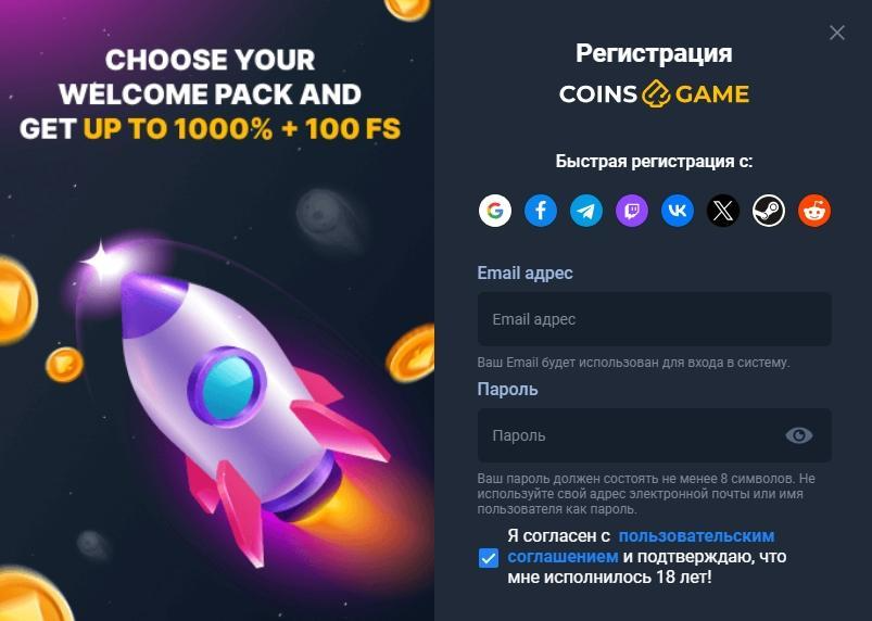 Войти аккаунт Сoins game очень просто, это можно сделать в один клик – через акаунт Гугл, Фейсбук или другим способом. Есть и стандартная форма, когда игрок указывает номер телефона или электронную почту и пароль.