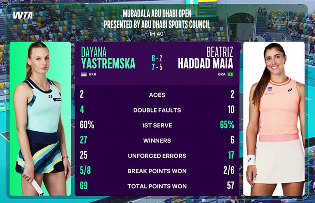Украинская теннисистка Дайана Ястремская пробилась во второй раунд турнира WTA 500 в Абу-Даби. В стартовом матче соревнований она одержала победу над представительницей Бразилии Беатрис Аддад Маей со счетом 6:2, 7:5.