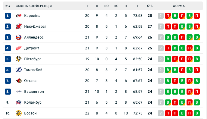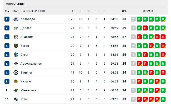 На Западе лидерство сохраняет Колорадо Эвеланш, которая обыграла Нью-Йорк Рейнджерс 6:3 и продолжила победную серию до семи матчей. Более того, Лавины не покидают площадку без очков уже 11 поединков подряд. В верхней части таблицы конференции также содержатся Даллас Старс, Анахайм Дакс и Вегас Голден Найтс.