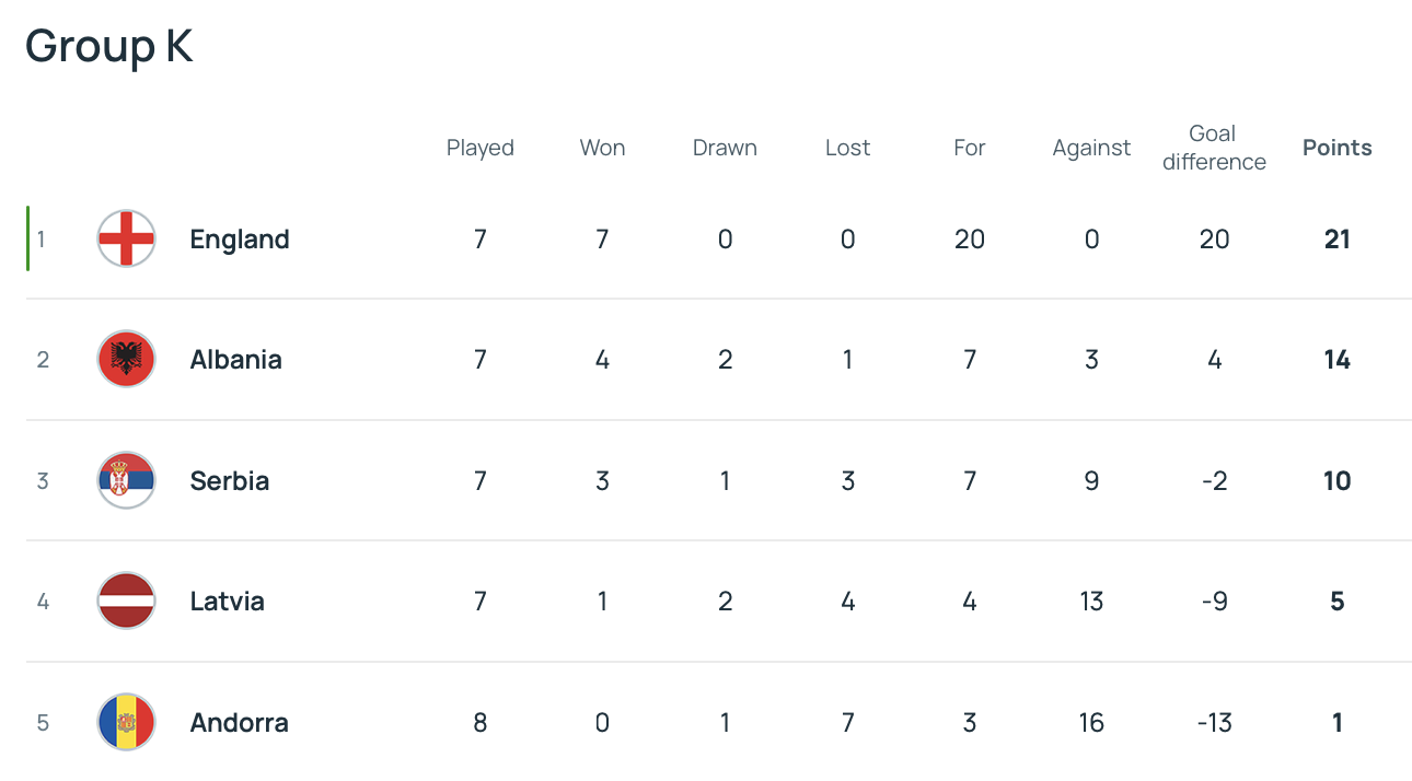 Сборная Англии набрала 21 очко и не потеряла ни одного балла, обеспечив себе участие в чемпионате мира-2026. Албания, имея 14 очков, сенсационно лишила Сербию (10) шансов на плей-оф.