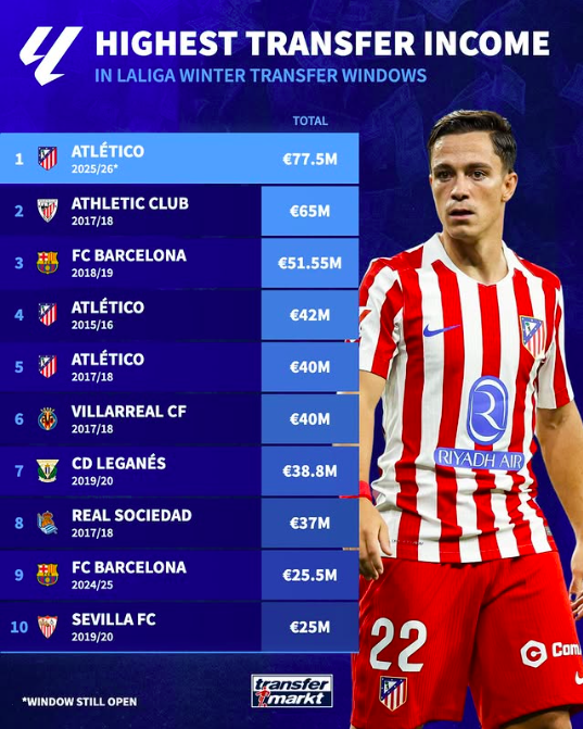 Мадридский Атлетико во время текущего зимнего трансферного окна переписал историю испанской Ла Лиги, став клубом с самыми большими доходами от продаж игроков в середине сезона. Команда Диего Симеоне уже получила 77,5 млн. евро, что является новым абсолютным рекордом для чемпионата Испании.