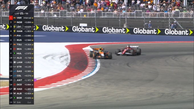 В ходе Гран-при США борьба за лидерство разгорелась уже на старте: Норрис атаковал Ферстаппена, однако чемпион мира уверенно отстоял позицию. Леклер воспользовался моментом и прошел Ланду.