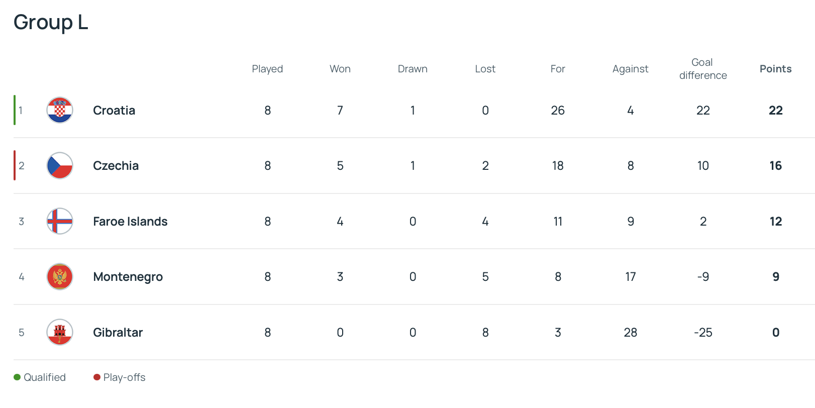 Хорватия уверенно выиграла группу (22 очка) и вышла на чемпионат мира. Чехия, занявшая второе место, продолжит борьбу в плей-офф.
