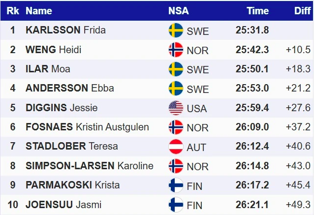 Победу, как и в прошлом году, одержала шведская спортсменка Фрида Карлссон. Она опередила свою соотечественницу Хейди Уэнг на 10,5 секунды. Третью дистанцию завершила еще одна шведка — Моа Иллар, что позволило представительницам Швеции полностью занять подиум.