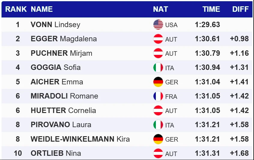 Она показала доминирующий результат, опередив австрийку Магдалену Эггера на впечатляющие 0,98 секунды. Тройку лучших дополнила еще одна представительница Австрии — Мирьям Пухнер, тогда как итальянская суперзвезда Софья Годжа завершила четвертую гонку. Для Эггеры это первый подиум в карьере на этапах Кубка мира.