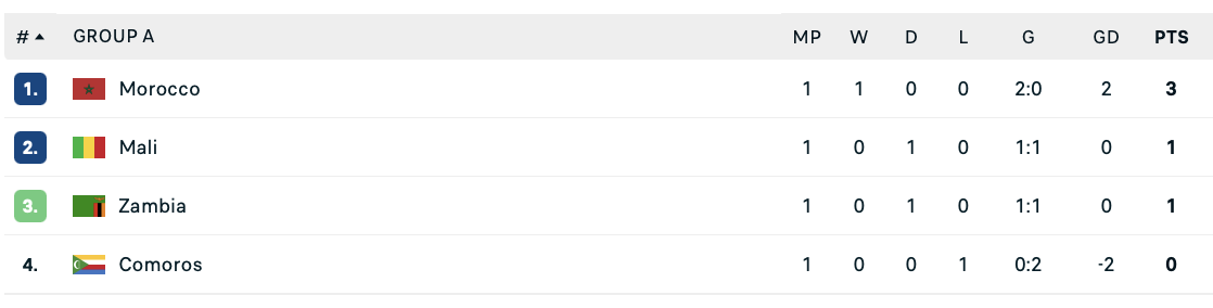 После первого тура лидером группы А остается сборная Марокко, которая ранее обыграла Коморские Острова со счетом 2:0.