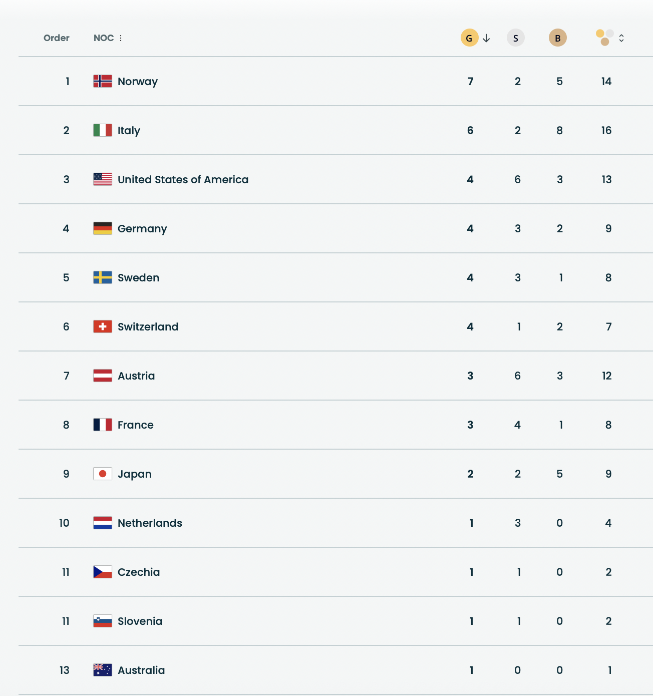 Сборная Норвегии продолжает удерживать первое место, имея в активе семь золотых медалей. Хозяева Игр – команда Италии – существенно сократили отставание и уже завоевали шесть наград высшей пробы.