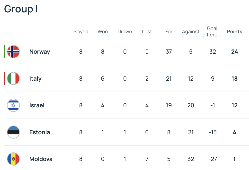 Италии для выхода на чемпионат нужно было победить дома с разницей минимум в девять мячей, но хозяева не сумели навязать борьбу. Итальянцы проиграли 1:4.