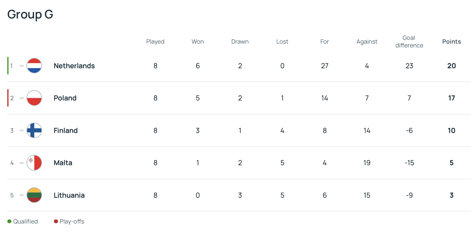 В другом матче группы Польша одержала трудовую выездную победу над Мальтой – 3:2. Благодаря этому результату поляки заняли второе место (17 очков) и вышли в плей-офф отбора ЧМ-2026.