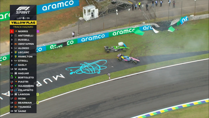 Главным эпизодом стал вылет Оскара Пиастри. Австралиец не справился с управлением на влажном поребрике и столкнулся с барьером. Сразу после него с трассы вылетел Франко Колапинто, что привело к появлению красных флагов и временной остановке гонки.