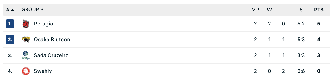 После двух туров Перуджа имеет две победы, пять очков и занимает первое место в группе.