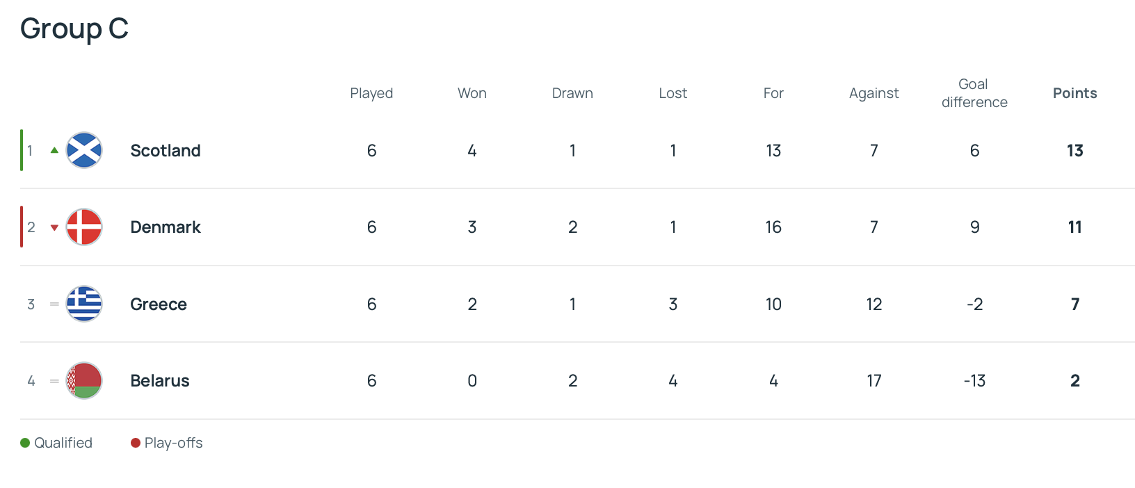 Шотландия заняла первое место в группе и напрямую вышла на ЧМ-2026. Дания завершила етап второй и продолжит борьбу в плей-офф.