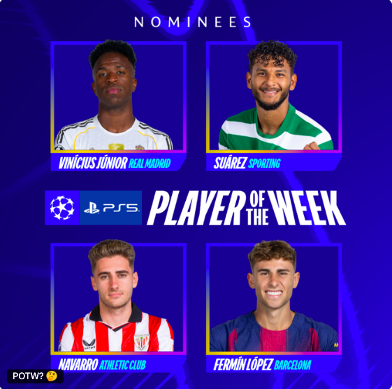 Конкуренцию игроку мадридцев в голосовании составят еще трое футболистов. Полузащитник Барселоны Фермин Лопес оформил дубль в поединке против Славии (4:2). Форвард Спортинга Луис Суарес дважды поразил ворота ПСЖ и помог лиссабонцам одержать победу 2:1. Также среди кандидатов оказался хавбек Атлетика Роберт Наварро, записавший на свой счет гол и два ассиста в игре с Аталантой (3:2).