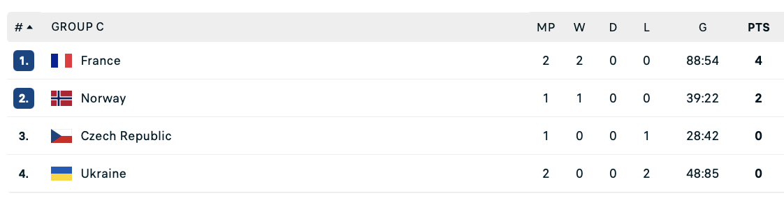 После поражения от Франции сборная Украины занимает последнее место в группе, не имея набранных очков. В случае, если Норвегия не проиграет Чехии, украинская команда досрочно лишится шансов на выход в следующий раунд чемпионата Европы.